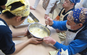 児童・成人の利用者様全員で力を合わせて「バナナパンケーキ」を作りました。